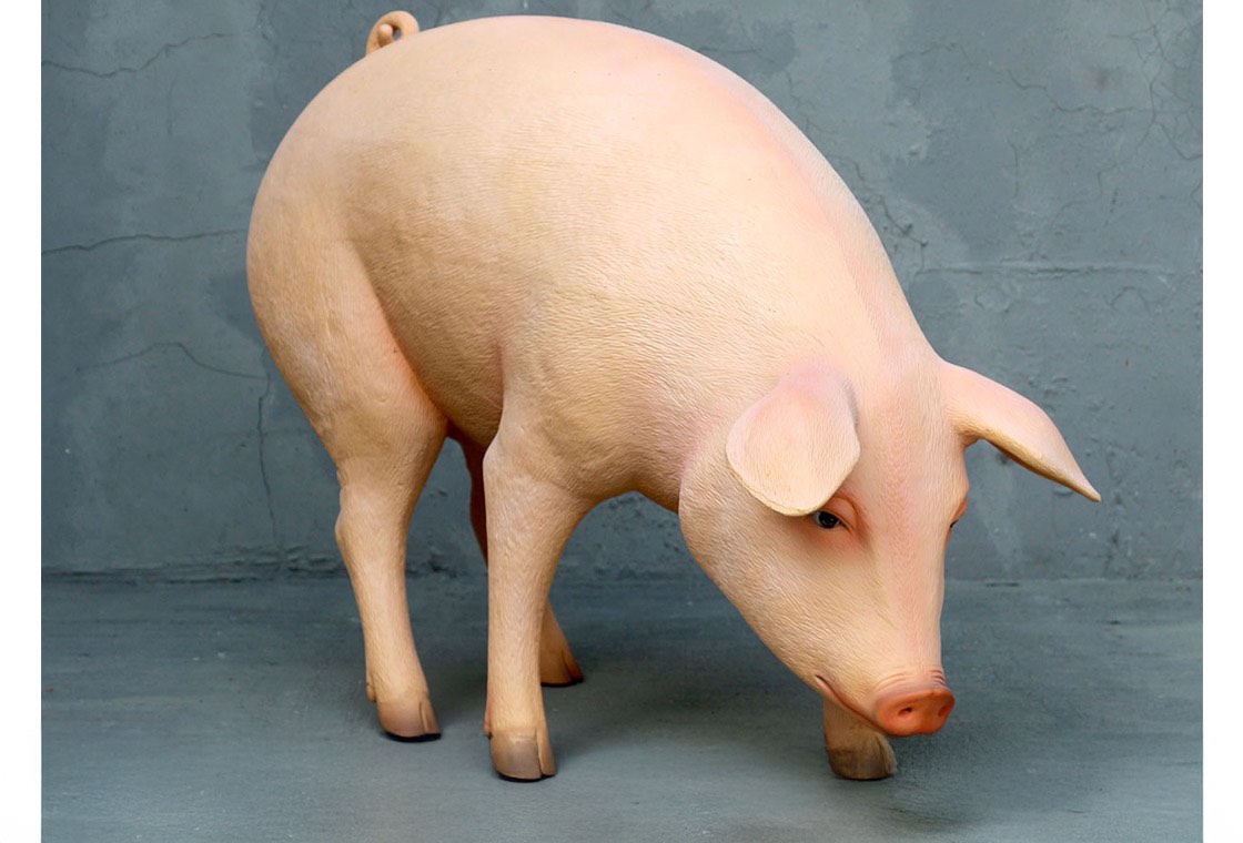 Other words describing our products: life size statue, fiberglass statue, farm animal figurine, pink pink statue with head down, pig sculpture, country farm theme props