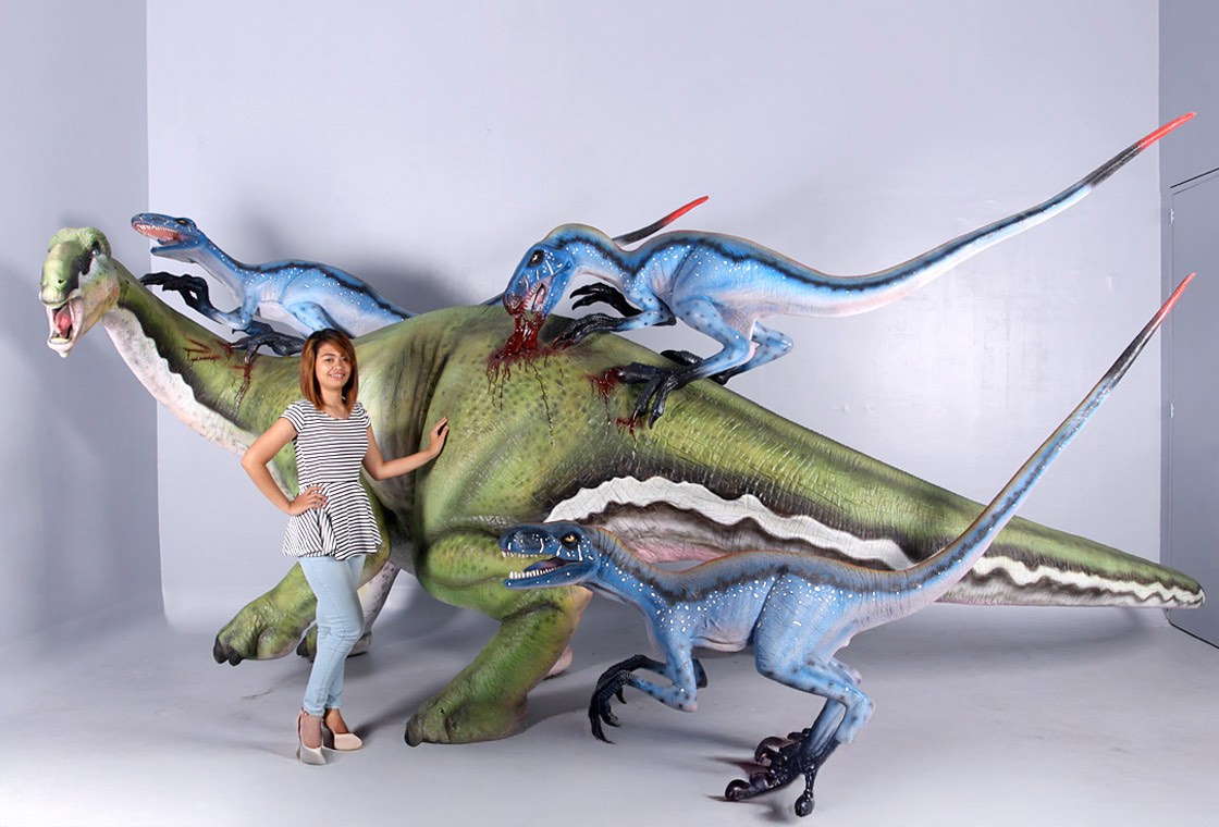 Fiberglass replica of a Tenontosaurus under attack by fellow Raptors! Good thing this prehistoric creature has a strong backside, those raptors won’t stand a chance once the tendons in its back and tail start flailing!