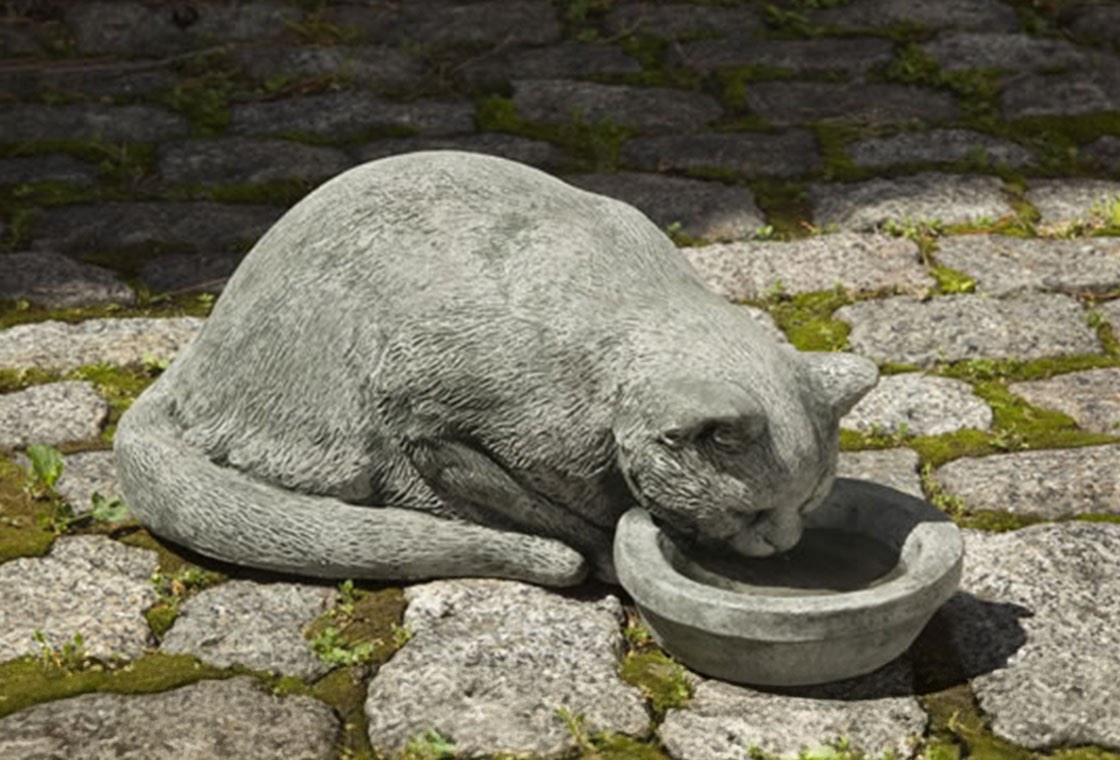 Different words describing our products: Life Size Statue; Fiberglass Statue; Animal Figurine; house cat statue; thirsty kitty sculpture; cast stone kitty; indoor cat water bowl statue; outdoor cat statue; garden cat statue>